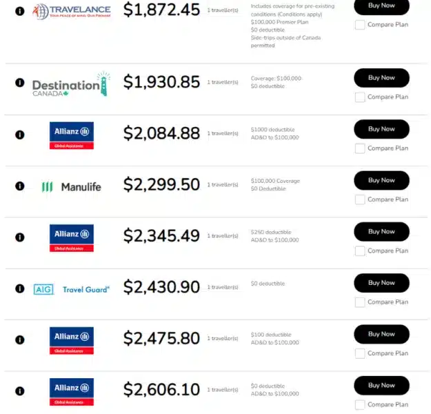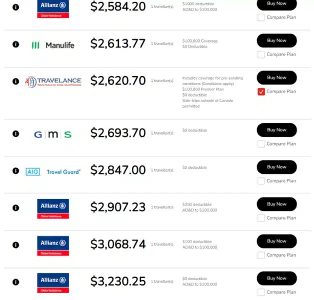 On the other end, we have Allianz Global Assistance providing an AD&D (Accidental Death and Dismemberment) policy for $3230.25 with a $0 deductible.