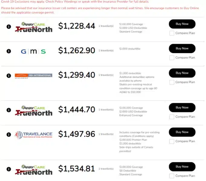 On the most affordable end, we have AwayCare TrueNorth for $1,243.95 for standard coverage with a $1000USD deductible.