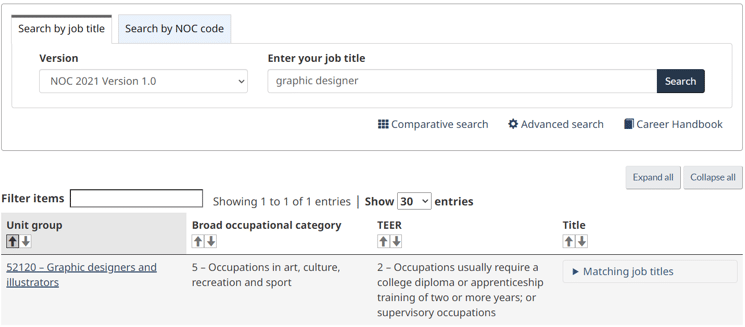For example, as shown in the image below, if you search for a graphic designer job title, you can find out your 5-digit code, TEER number and occupational category. You will need the code when you are applying online so it is of the utmost importance that you have the right 5-digit code that matches your job title.