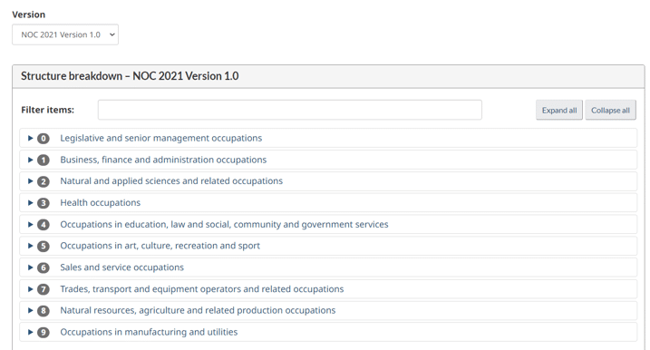 Keeping those minor groups in mind, go to the hierarchy and structure section and drill down the structure to list all NOC unit groups found under the relevant NOC minor groups. You can then access the occupational description of each unit group to find where your occupation has been classified.