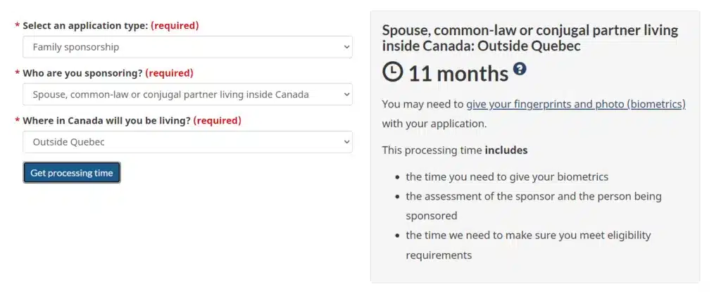 - Inland Spousal Sponsorship (outside Quebec): 11 months
