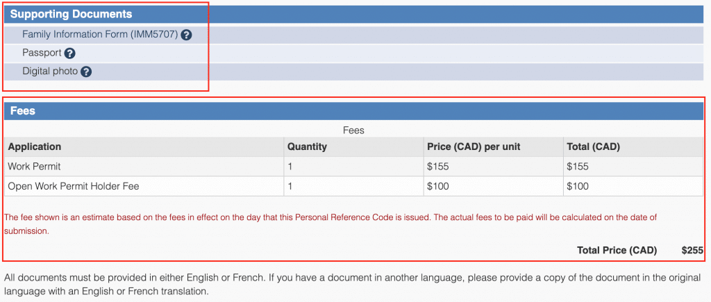 The fee includes Work Permit fee of $155 and Open Work Permit Holder fee of $100. The total application fee is $255.